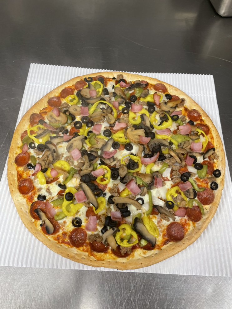 Pepperoni, sausage, ham, onions, green peppers, banana peppers, mushrooms, black olives.
